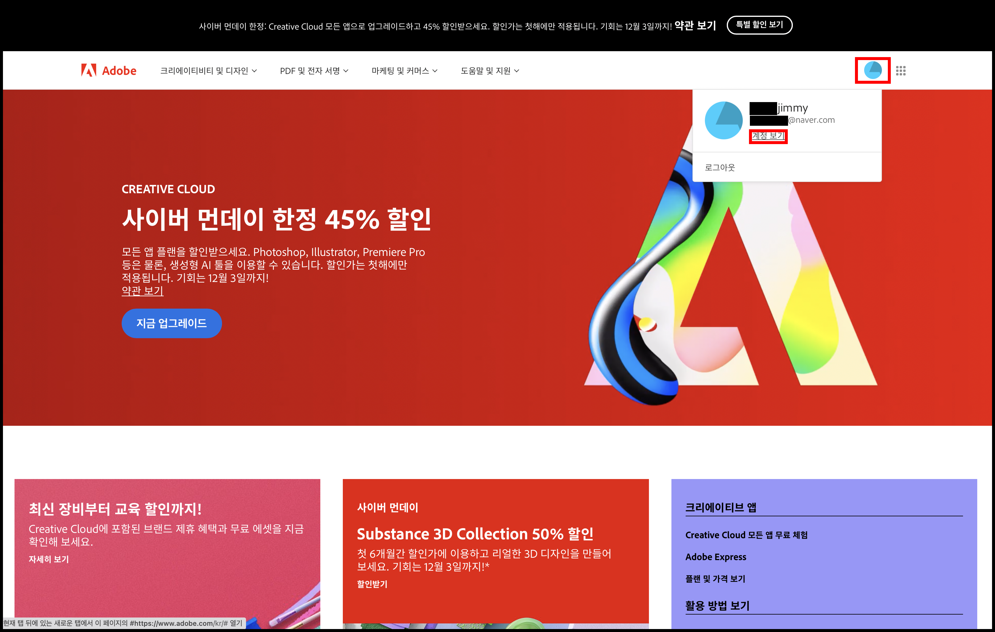 어도비 홈페이지에서 로그인을 합니다.