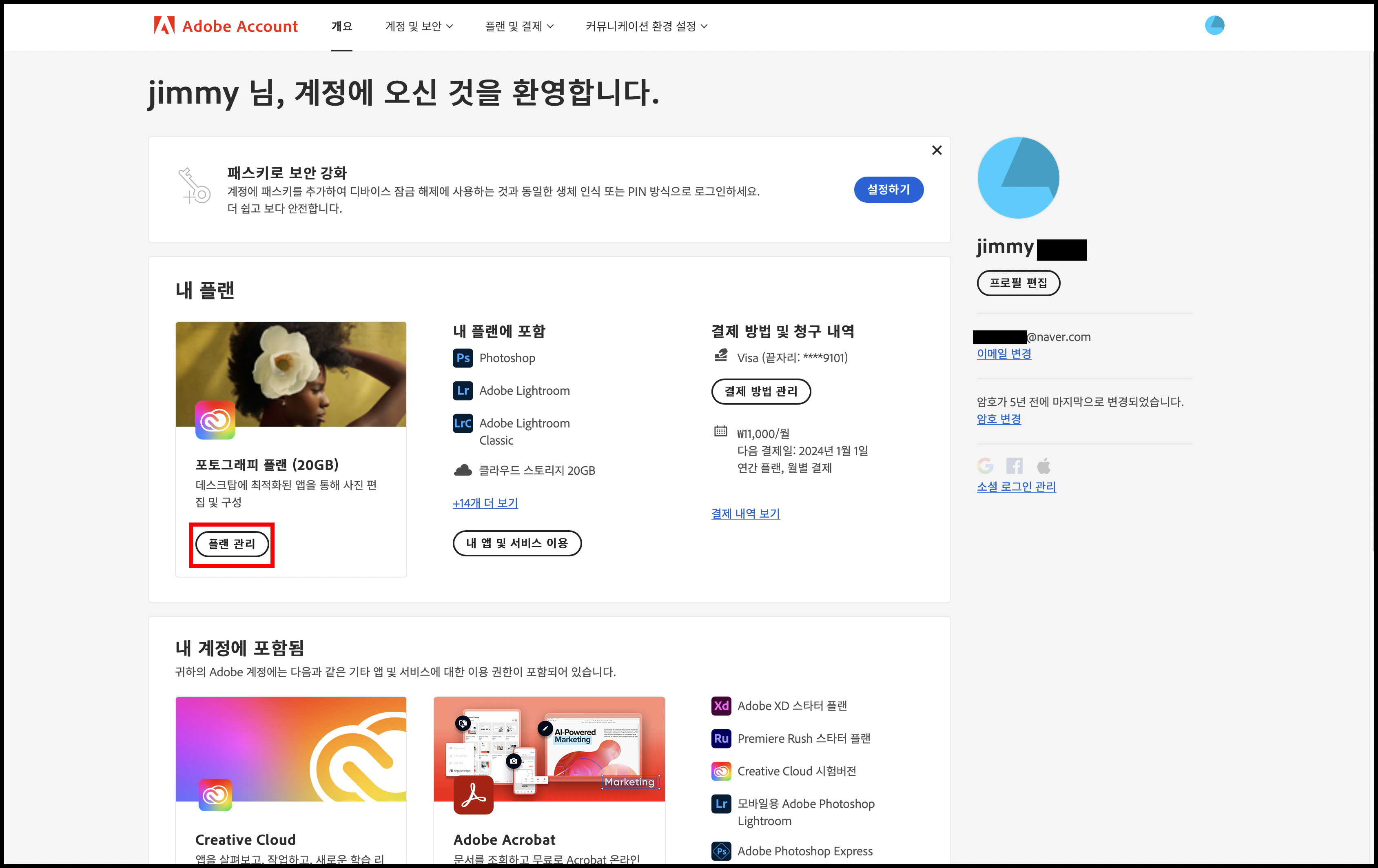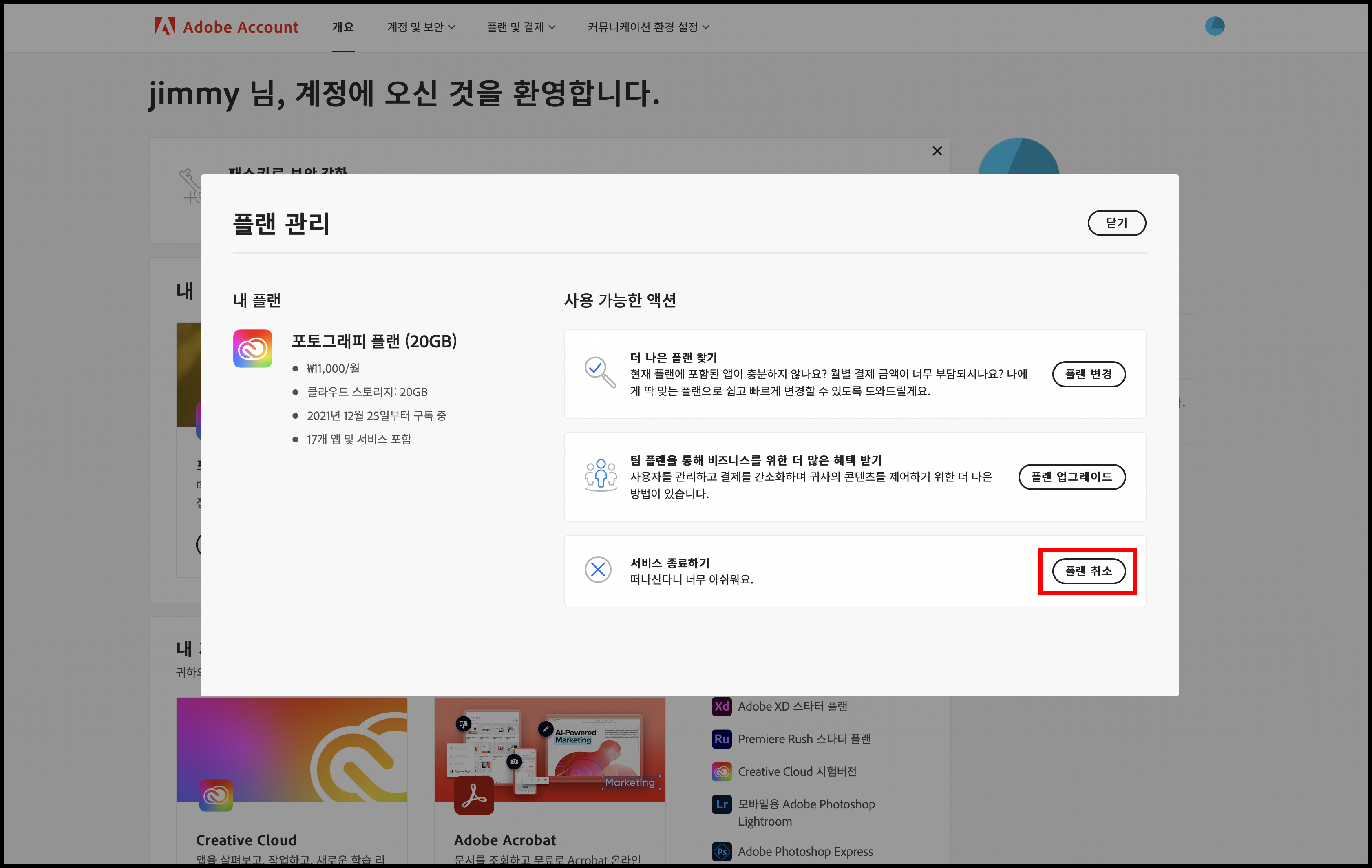내 플랜에 포토그래피 플랜이 보이네요. 플랜 관리를 클릭합니다.