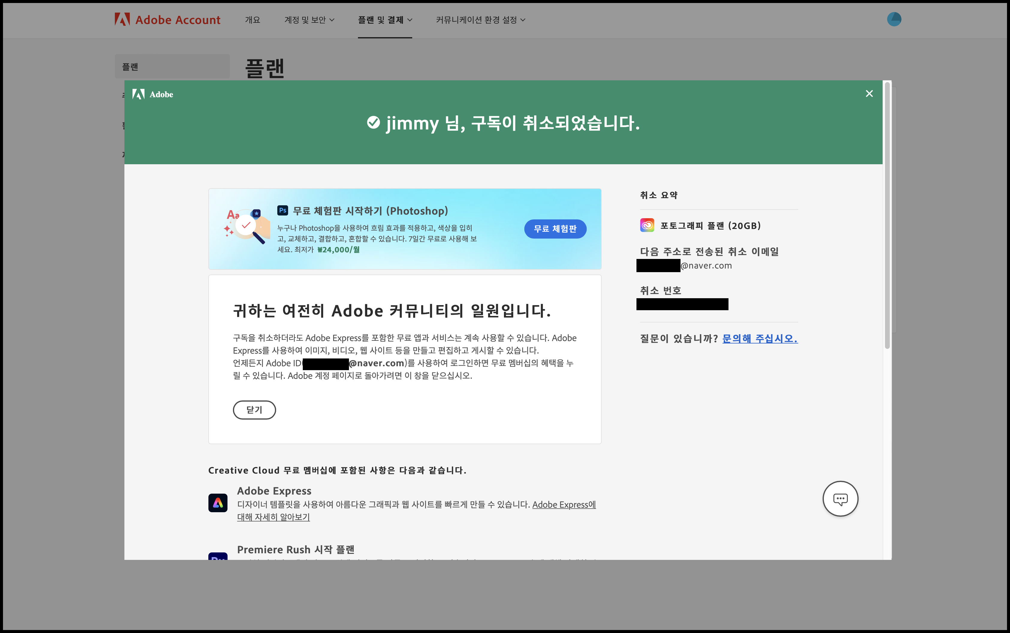 어도비 포토그래피 플랜 구독이 해지되었습니다.
